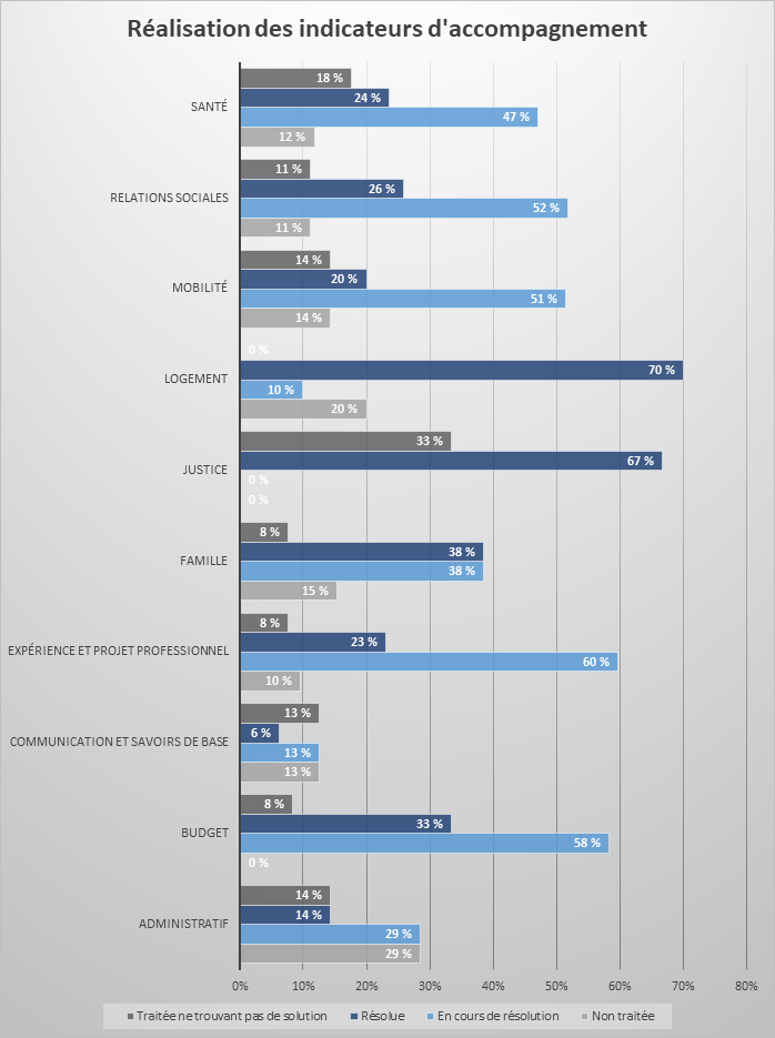 En bleu foncé les problématiques ont été résolues, en bleu clair elles sont en phase de résolution. En gris clair le travail reste à faire et en gris foncé les problématiques sont identifiées comme irrésolvables. On observe ici surtout le fait que certaines problématiques sont résolues rapidement à l'arrivée dans la structure (logement, justice) d'autres font le corps de l'action à moyen terme (budget, projet, relations sociales, mobilité...) La santé, la mobilité et la justice sont les catégories où nous rencontrons le plus de difficultés à en résoudre l'ensemble.