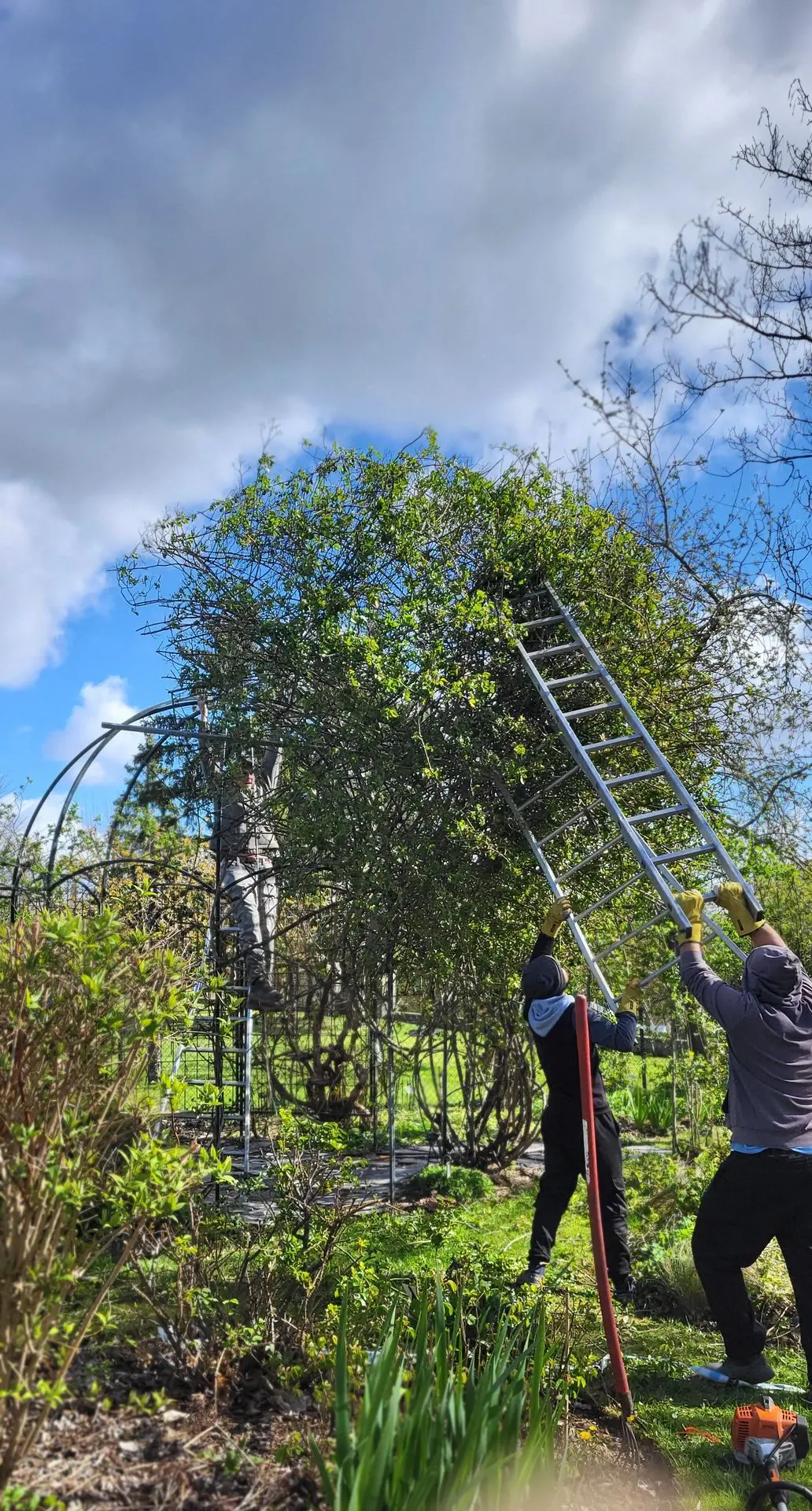 Les vents de Mars n’ont pas épargné notre belle roseraie. Un des rosiers a été fortement endommagé et s’est retrouvé la tête en bas. Bernard, Vincent, David, salariés au jardin et Swann, bénévole, ont entrepris de le sauver ! En un instant, les jardiniers se transforment en acrobates pour redonner toute son allure à ce joli rosier avant la saison des roses qui débute dans un peu plus d'un mois.
