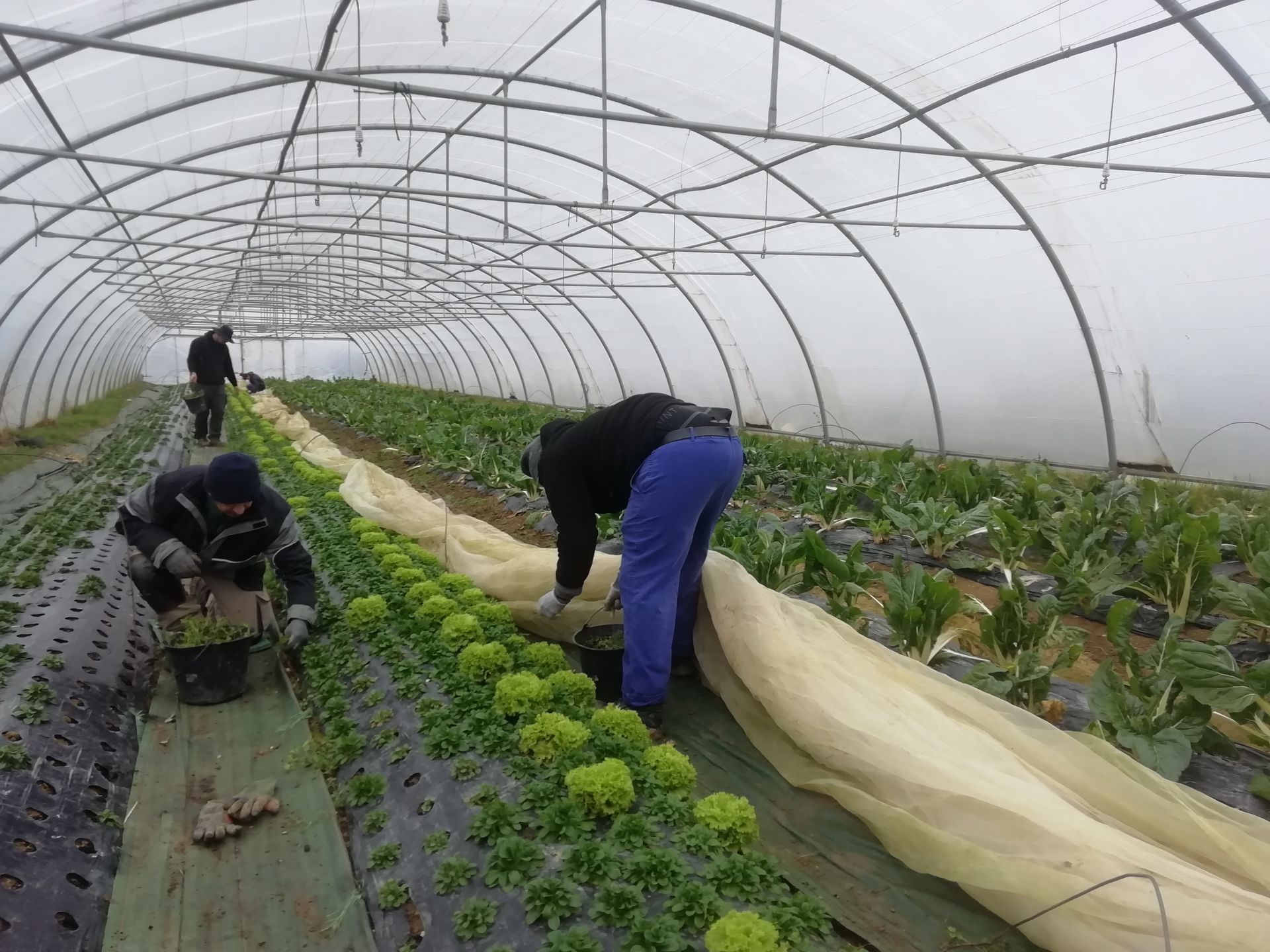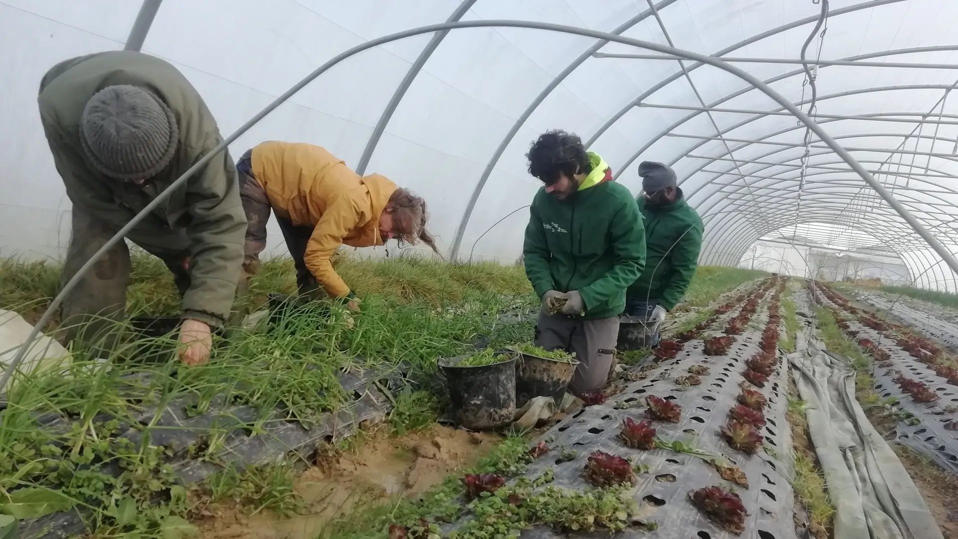 Nous continuons autant que possible le travail d'entretien des cultures en serres. Alexis et son équipe désherbent les oignons blancs alors que José, Ranash, Mickaël et William font un sort aux adventices d'une planche de laitues et de mâche.