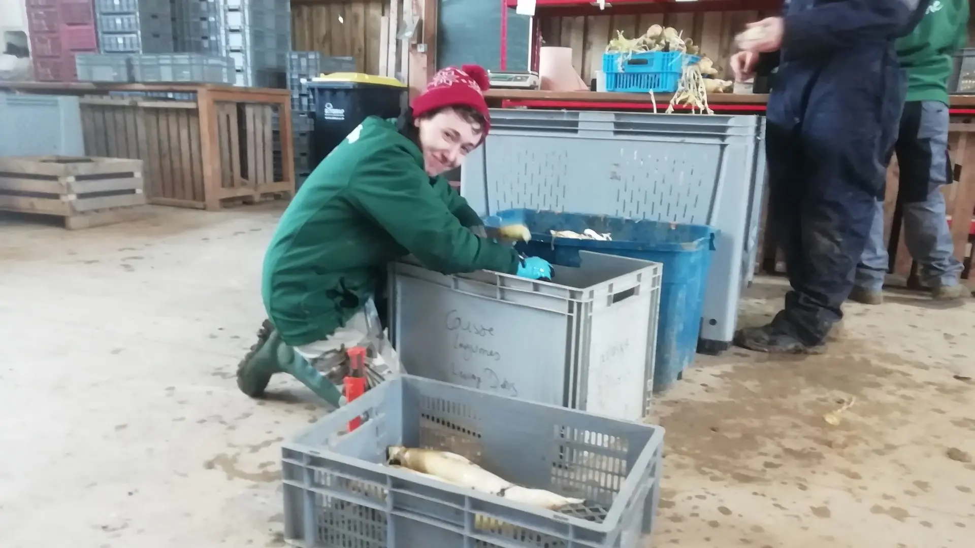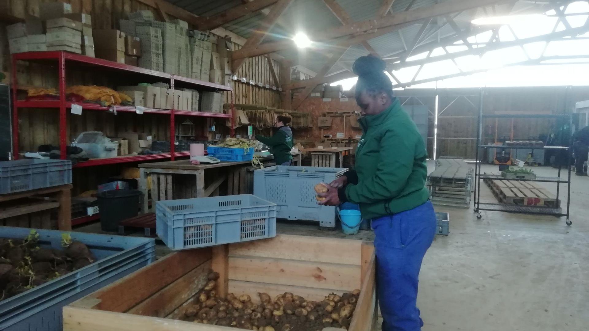 Sous le hangar, on prépare les paniers. Mallaury choisit les radis Daïkon pendant que Trina trie les pommes de terre. Une équipe de maraîchers s'occupe de la récolte du pourpier; une autre lave les poireaux qui seront bottelés dans un second temps.