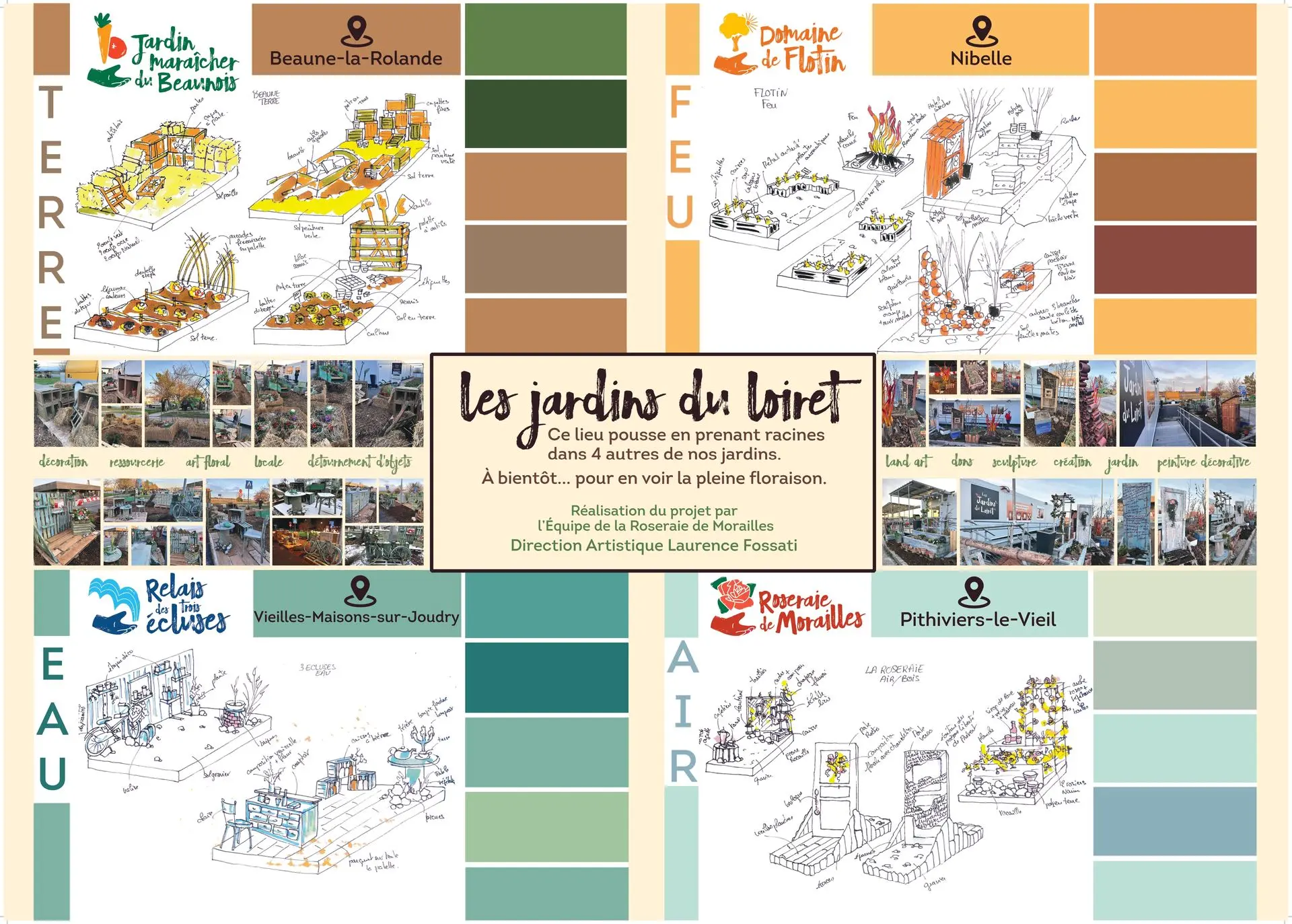 Ainsi, au moyen d’objets et matériaux chinés en brocante ou autres ressourceries locales, cette création a pu voir le jour. Elle représente à elle seule, l’âme des 4 jardins existants dans un lieu unique : les Jardins du Loiret. Le thème de l’Eau est associé aux Relais des 3 Ecluses et sa proximité avec le canal d’Orléans ; le Feu représente l’esprit créatif du Domaine de Flotin ; la Terre, le terreau du Jardin « mère » du Beaunois et l’Air souffle le parfum des roses de la Roseraie de Morailles.