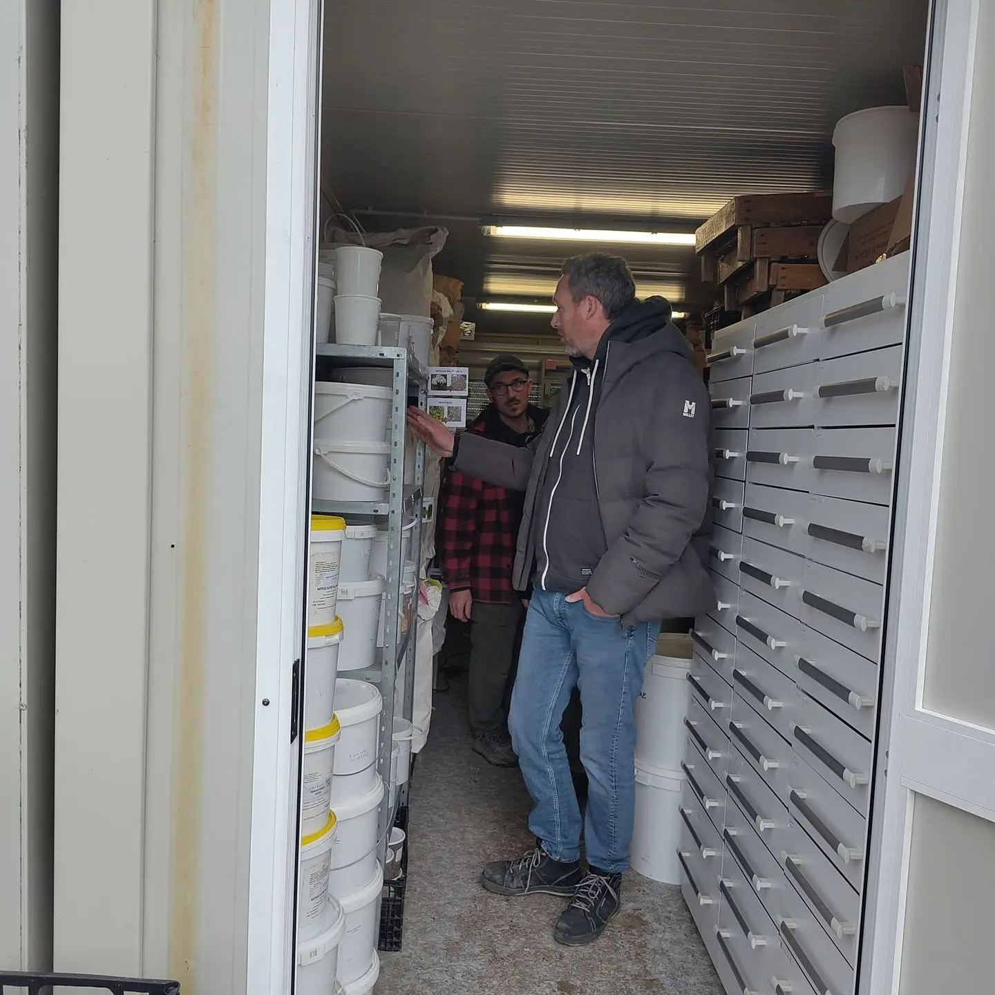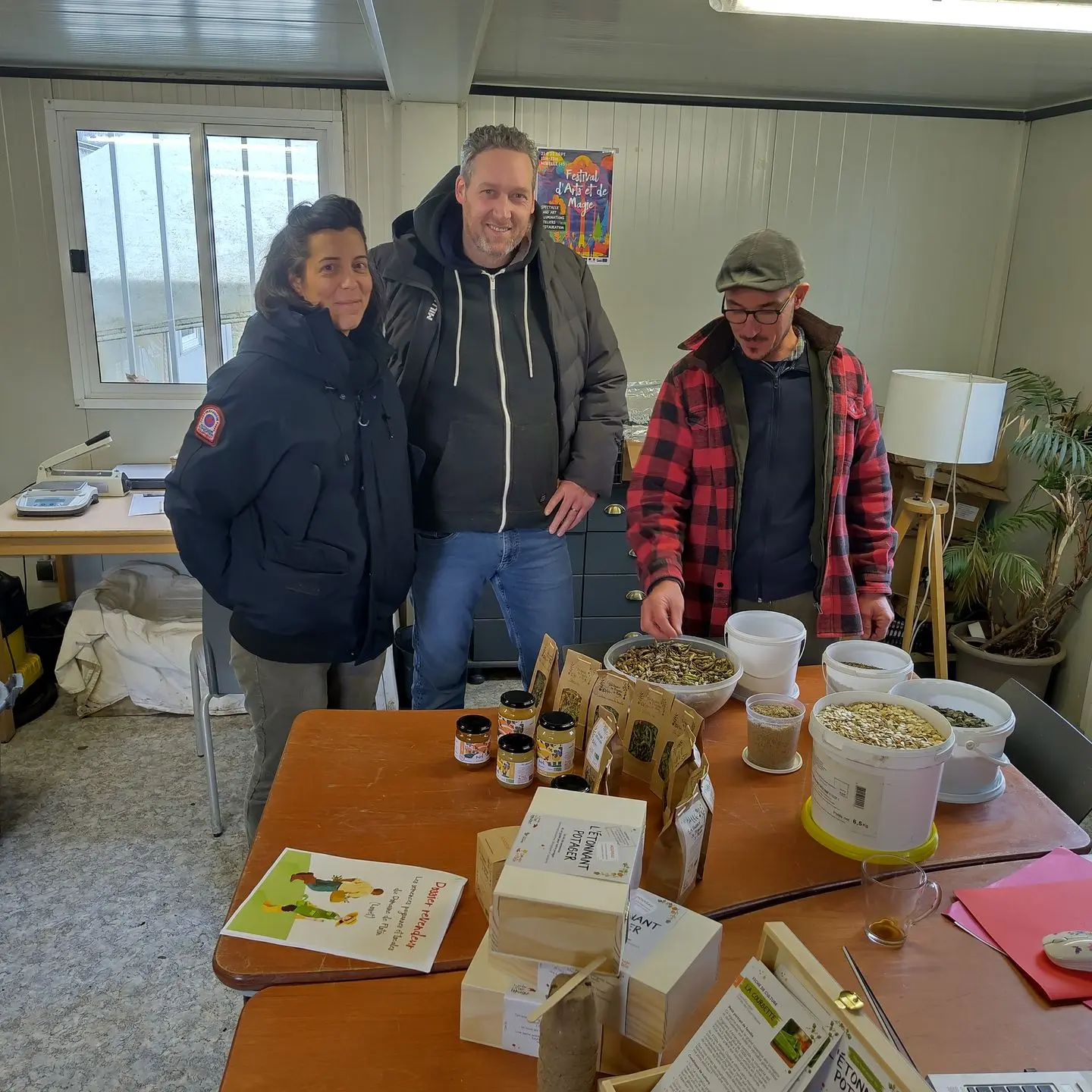 Ce mercredi 28 janvier, Flotin a eu le plaisir d’accueillir l’équipe de la Biocoop pour une visite guidée du domaine et du stock de semences, avec un nouveau présentoir réalisé spécialement pour eux.