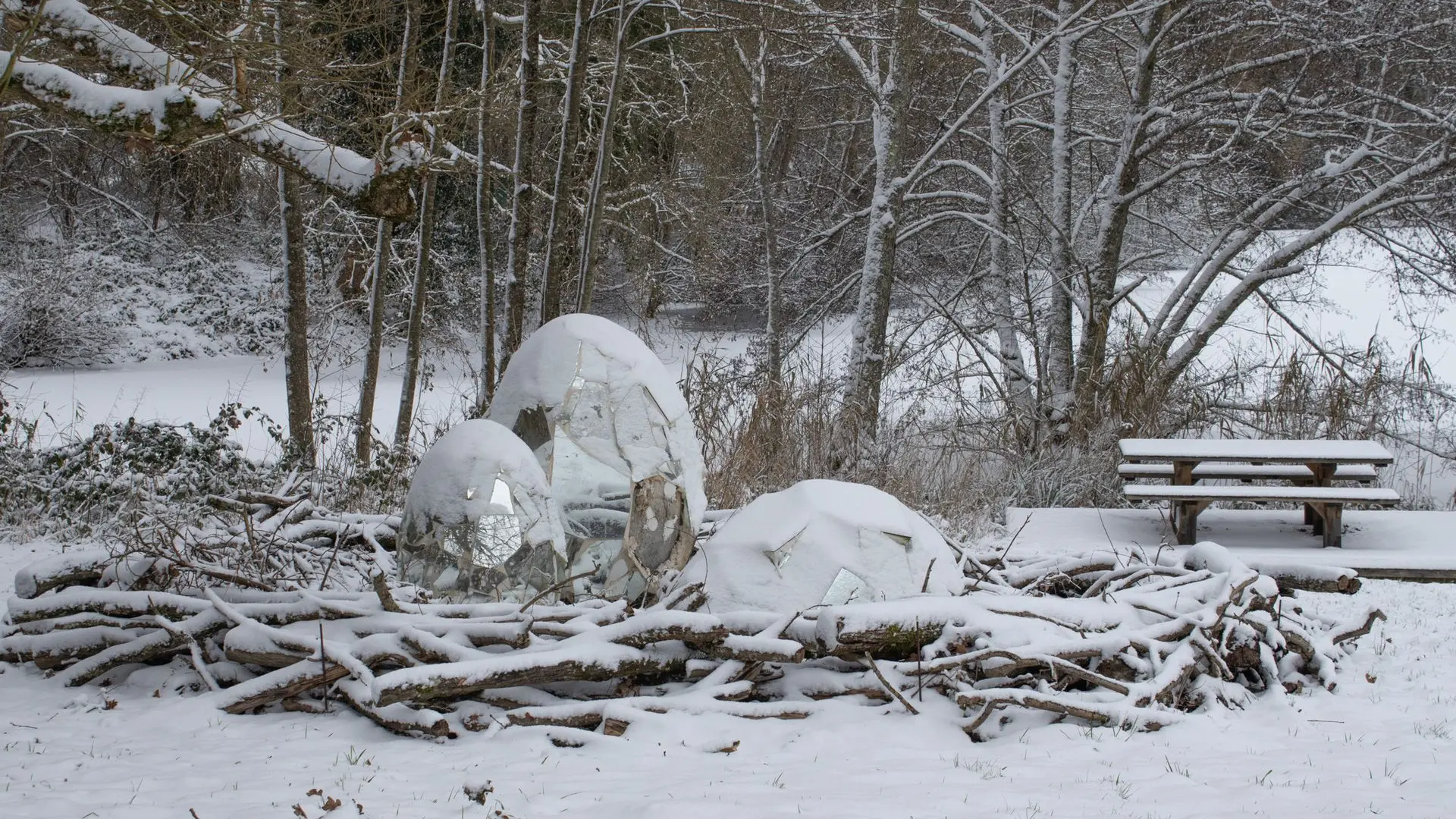 La forêt, plongée dans le silence, voyait ses arbres givrés entourer le grand renard en bois, tandis que les points d’eau, à demi gelés, sommeillaient sous le manteau blanc
