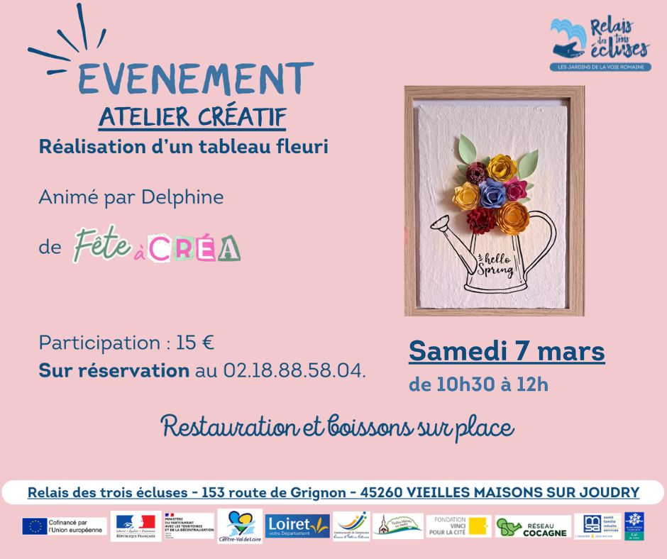 Retrouvez-nous le samedi 7 mars, de 10h30 à midi, au Relais des Trois Écluses pour un atelier créatif animé par Delphine de Fête à Créa . Venez partager un moment convivial et créatif !